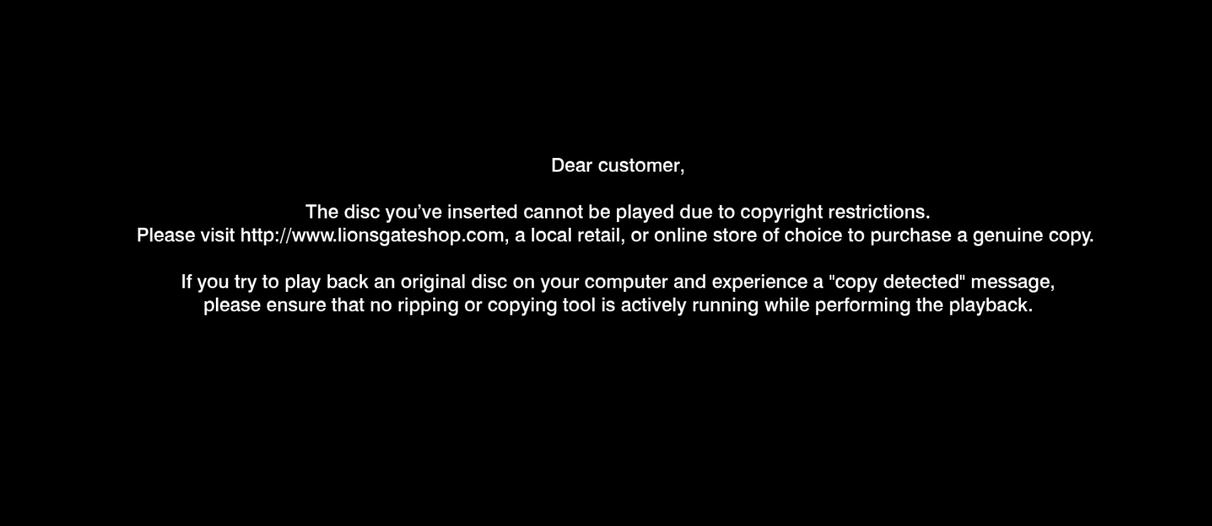 Today I attempted to watch Robocop (Bluray) on my VLC, I own the Bluray disc and popped it into my player and it wouldn't launch. Thinking it was a little odd I made sure to redownload the right plugins and whatever else needed to properly play and I even updated my VLC just to be sure, still wouldn't launch. Frustrated I tried watching on a different player (SMviewer or something like that) and it still wouldn't launch. I gave up on Robocop and felt like watching something new, figuring my disc maybe wasn't up to snuff or whatever so I moved on too John Wick. Now it started and all that but as soon as I get to about the three minute mark, it gives me this: https://i.gyazo.com/035ce680eb33d78ee10945122e6cac6b.png